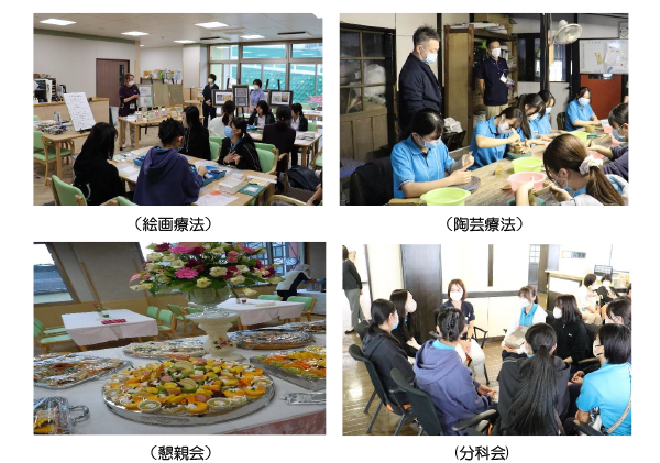 令和7年10月24日(土)に武雄看護リハビリテーション学校、西九州大学などの学生37名と放送大学より2名の先生にご参加を頂き、第25回アートセラピー美術館祭を開催しました。最初に当院の美術館を見学して頂いたところ、患者さんが描かれた絵画を前に、その大きさや緻密さに驚かれている様子が伺えました。次に当院で取り組むアートセラピー(芸術療法)である、絵画療法、陶芸療法、音楽療法、モノづくり療法、コラージュ療法の中から事前に申し込まれた療法を体験して頂きました。陶芸療法では「陶土の感触に癒されました」や「作品の出来上がりが楽しみです」などの感想がありました。また絵画療法ではパステルでマンダラ模様を作成して頂きましたが、皆さん無心になって取り組まれて「時間が経つのが早かった」との感想があり集中されていたことが分かりました。 療法終了後には「クリエイティブセンターみらい」にて懇親会を開催し、和やかな雰囲気の中で食事を楽しんで頂きました。華やかな食事にとても喜んでいただけたようです。